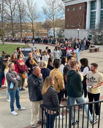 Two weeks later: People waiting to enter Hughes Auditorium, Asbury University